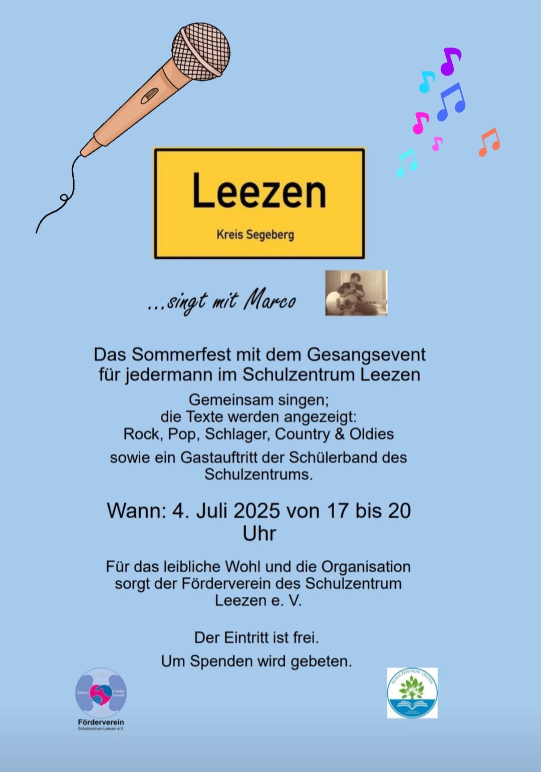 Leezen singt im Schulzentrum Leezen mit Marco Von Torsten Bukowski|30.06.2025| Beitrag teilen! FacebookWhatsAppE-Mail Ähnliche Beiträge Einschulungsfeiern 2024 Einschulungsfeiern 2024 07.09.2024 Save the date Leezen rockt am 12.10.2024 Save the date Leezen rockt am 12.10.2024 25.08.2024